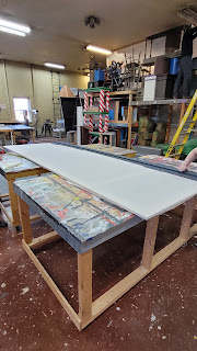 I learned how to spatter with this show. It's a technique that is used a lot in theater that has eluded me up to now. It took awhile to get the hand of it but by the end I was doing OK with it. I also had to paint details on chairs and boxes and paddles too! It is always interesting what you end up doing when you are a scenic painter! For example painting paddles orange!